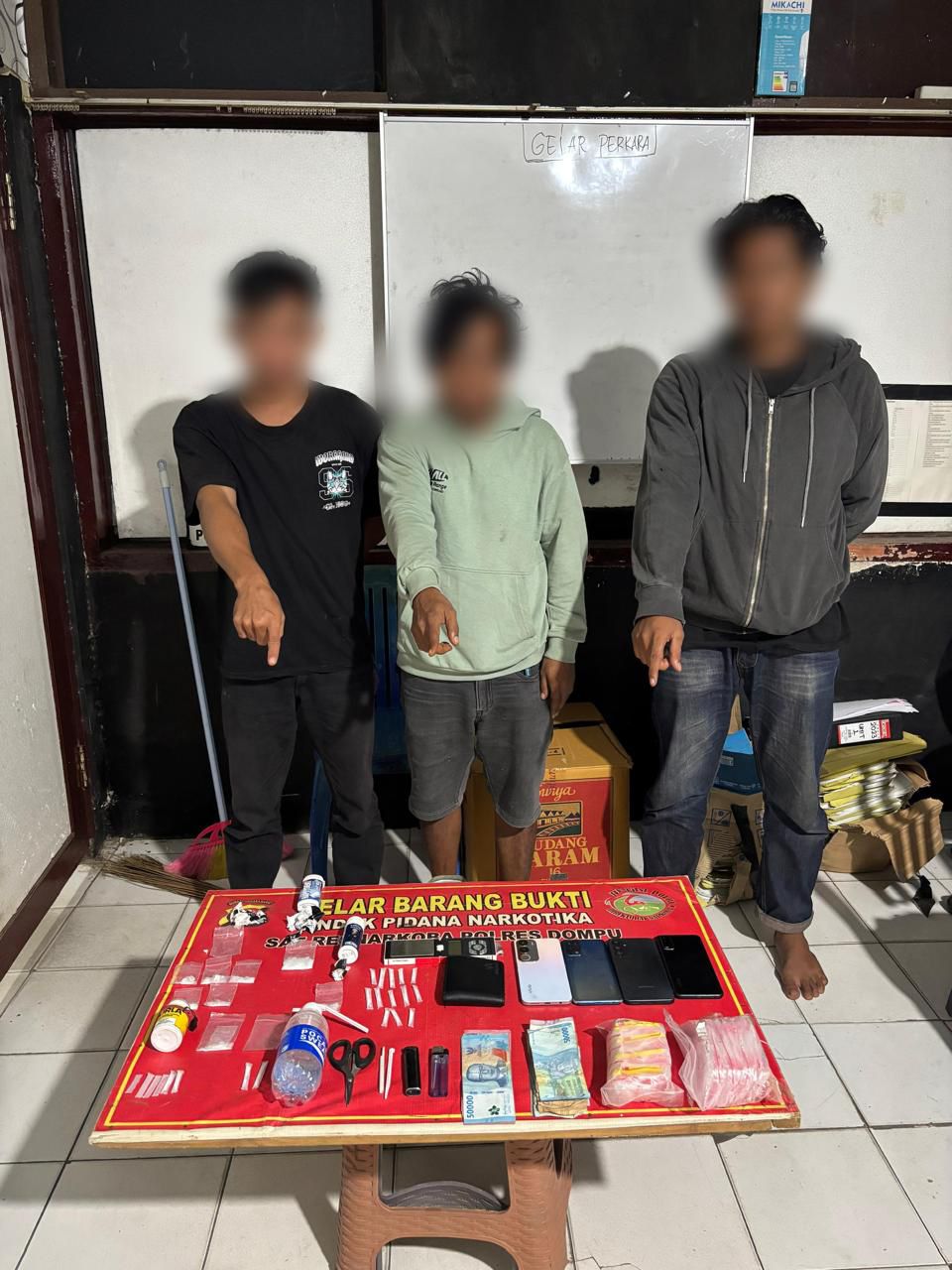 Dalam operasi tersebut, tiga pria masing-masing berinisial S (38), P (27), dan M (27) berhasil diamankan. Petugas juga menyita barang bukti yang diduga kuat narkotika jenis sabu dalam berbagai bentuk kemasan dan perlengkapan lainnya.