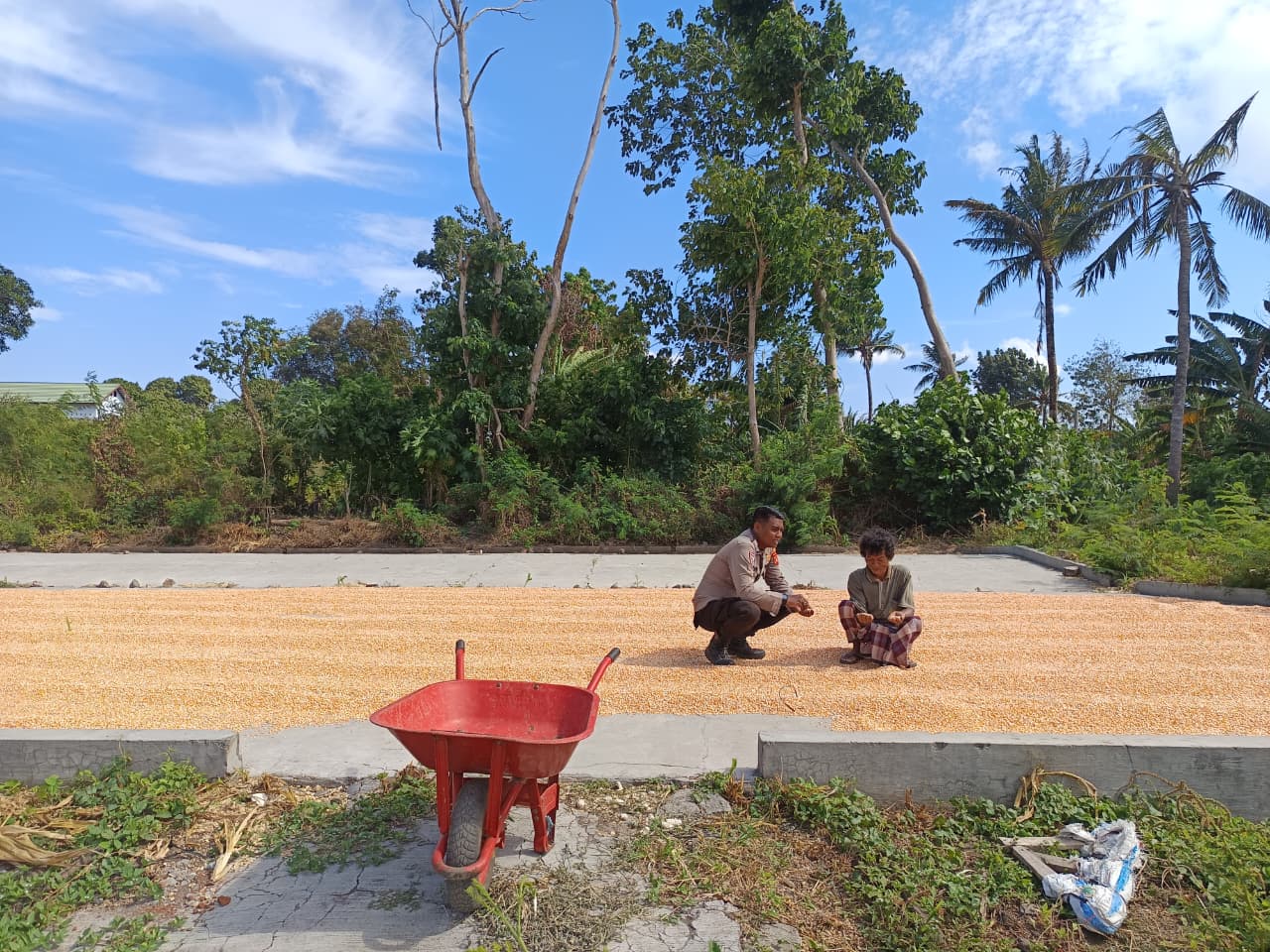 Pada kegiatan tersebut, Brigadir Husnul memantau langsung proses penjemuran hasil panen jagung di lahan milik Bapak Ali seluas ±1 hektare. Lahan tersebut telah ditanami jagung varietas NK Sumo, yang kini telah memasuki masa panen pada usia tanam 120 hari, sesuai jadwal pola tanam kuartal ketiga tahun 2025.