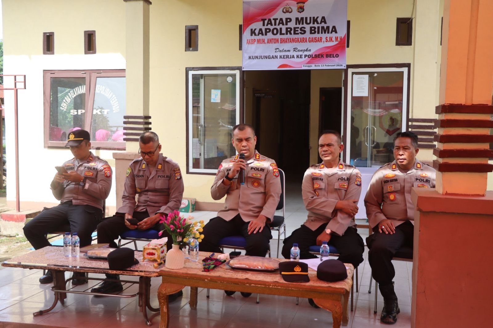 Kapolres Bima Kabupaten Polda NTB AKBP M.Anton Bhayangkara Gaisar S.I.K., MH.,didampingi Ketua Bhayangkari Cabang Bima Ny. Lia Anton melaksanakan kunjungan kerja (Kunker) resmi di Mako Polsek Belo