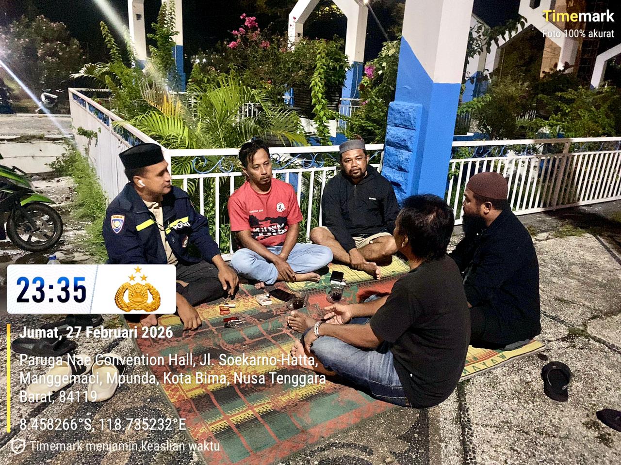 Kegiatan tersebut dilaksanakan pada Jumat, 27 Februari 2026, pukul 23.30 Wita, bertempat di Paruga Na’e, Kelurahan Manggemaci, Kecamatan Mpunda, Kota Bima, dengan menyasar tukang parkir serta warga dan pemuda yang sedang berkumpul di sekitar lokasi.